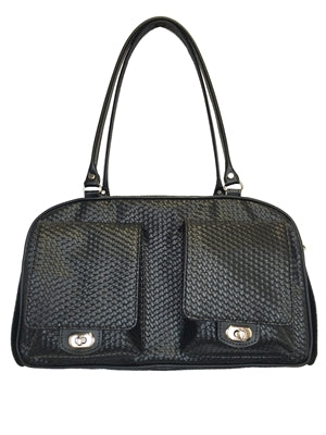 Black Woven Marlee Bag - Brand new at Petote for Fall 2016! Our best selling Marlee Bag has been updated with chic black woven faux leather and silver hardware. This chic dog carrier will look oh so stylish wherever you go. The Marlee Bag looks just like a designer handbag and is also the perfect sneak bag. Because the marlee bag has flaps on both ends that roll up and down, this is a great style bag to use when you want to sneak your dog into stores, restaurants, or any place you go! Now you can take your dog anywhere and everywhere with you! Petote Marlee Bag is also airline approved!
